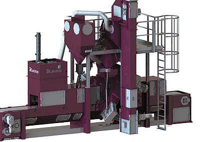 The cleaning station that follows the blasting process receives the data from the height detection of the workpieces in order to position the brush appropriately for the surface. It is important that the bristles only touch the surfaces minimally. Otherwise they wear out too quickly. Additionally installed nozzles blow off the workpieces. Manual sweeping is not necessary. All the abrasive is collected in the bottom area of the blast machine, freed from coarse impurities by means of a vibro chute and passes into the upper part of the machine via a bucket elevator. Here, a well adjustable, optimally designed wind sifter ensures that sand, dust and undersize particles are removed from the abrasive. The cleaned abrasive is fed back to the turbines and the cycle is closed.