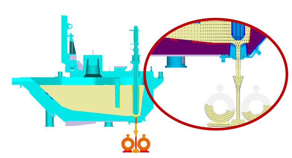 Another major topic was the design of the slag weir to prevent process slag in the area around the stopper. This slag weir extends the service life of the stopper and nozzle but ensures at the same time no slag particles are poured. As important as this slag weir is to keep clean melt and stopper and nozzle, when changing alloys, it increases the time for fresh melt of the new alloy and the previous alloy to mix in the heal of the vessel.