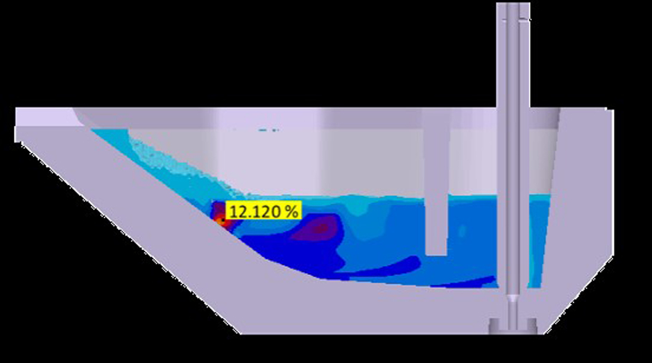 In order to optimize all requirements in relation to each other, several designs of a new slag weir were drawn and simulated as. These comparisons also brought new and unexpected results, which also gave valuable information for future developments. In this way, the heal in the vessel could be reduced by more than 25%. About six seconds after the start of recharging, the fresh melt has reached the area of ​​the plug and nozzle. The mixing takes place very quickly. As a result, an alloy change can be carried out by over-treatment of the fresh melt in many cases without first emptying the vessel.