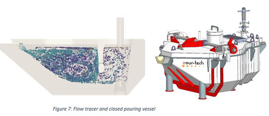 Based on intensive preliminary discussions between pour-tech AB and M5/MAGMASOFT on technical questions, the first simulations were carried out. They showed the optimization potential for various topics that had not been thought of, which were also tackled immediately. This included the optimization of the refractory lining of the vessel in the inlet for low-turbulence recharging and thus the reduction of the air entrapment of the melt in the otherwise closed pouring vessel. As a result, the angle at which the melt hits the lining was optimized and the air entrapment was reduced to below 10% of the initial value.