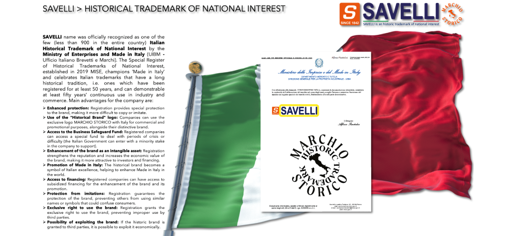 -  	Use of the Exclusive Logo: SAVELLI is now entitled to display the official “Marchio Storico di Interesse Nazionale” logo alongside its own brand in advertising and promotional materials — a powerful symbol of quality and tradition.